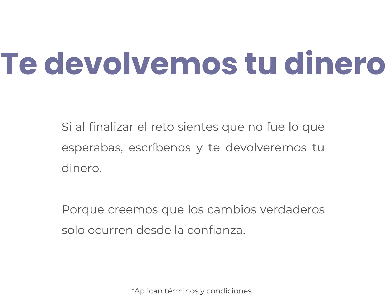 Si luego de finalizar el reto sientes que el programa no es para ti, te devolvemos tu dinero.